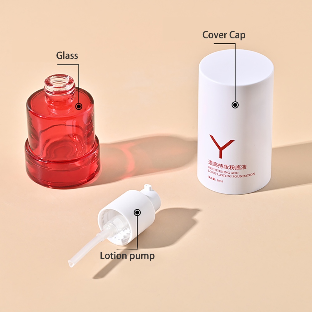 سعة هذه الزجاجة هي 30 مل. الجزء العلوي أضيق بينما الجزء السفلي أوسع. الجزء السفلي المضخم يجعل الزجاجة أكثر استقرارًا. يتم اقتران جسم الزجاج الشفاف أو المجمد برأس مضخة سائلة ذات خيوط بيضاء ، وهو أمر مريح لملء (يمكن تخصيص جسم الزجاجة ليكون شفافًا أو في لونه الأصلي ، ويمكن أيضًا صب غطاء الزجاجة بالحقن باللون المطلوب وفقًا للمتطلبات). هذا الغطاء المقاوم للغبار المنعكس جميل ومقاوم للغبار.