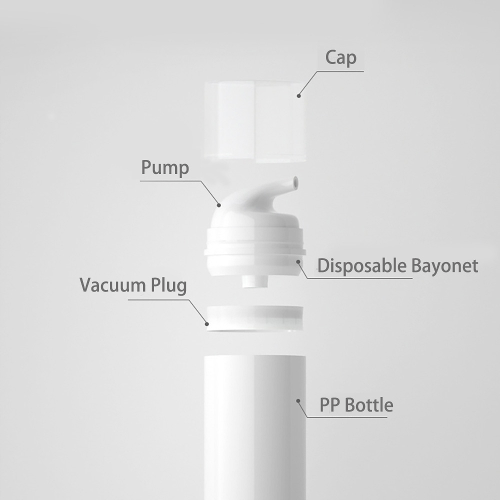 この無気ボトルはボトルボディ、ボトルキャップ、プレッシングポンプヘッド、一回のスナップオン部品および真空プラグで構成されています。液体出力は0.4 MT/Lです。