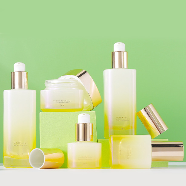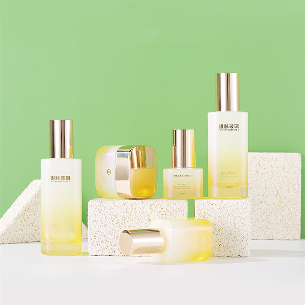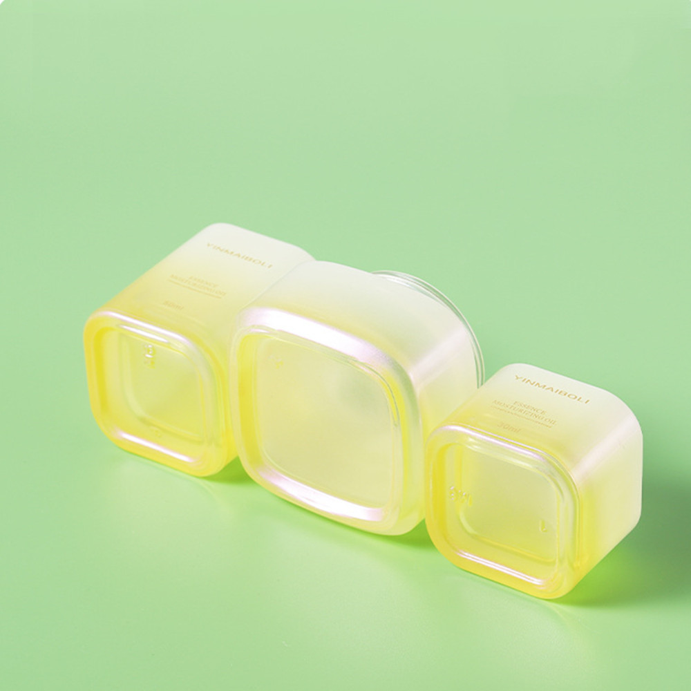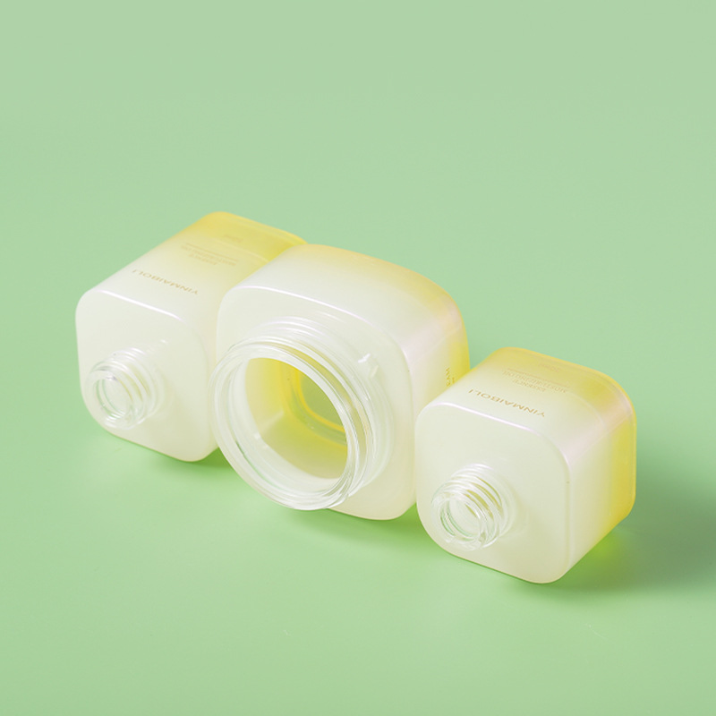 O conjunto quadrado e redondado de frascos está disponível em vários tamanhos, incluindo frascos de 50g de creme, 30ml, 50ml, 100ml e 120ml de lotão. A garrafa é projetada com um formato plano e redondo, e pintada em uma cor amarela gradiente. A impressão de tela personalizada, o selo de ouro e outros processos também podem ser aplicados ao corpo da garrafa.
